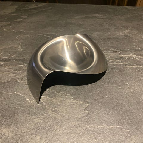 Georg Jensen skål i metal med en diameter på cirka 7cm. Skålen har en ribbet overflade og medfølgende ske i metal. Velegnet til salt.