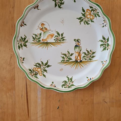 Moustiers keramik dekorationsfad med håndmalet barnefigur og blomsterdekorationer.