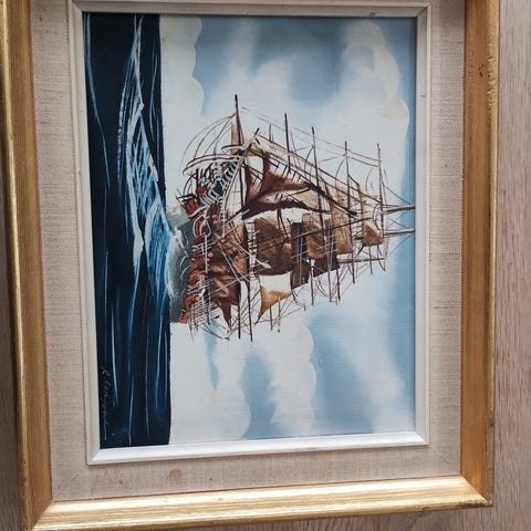 Anton J. maleri med motiv af sejlskibe ved Cairo. Olie på lærred med synlig signatur og årstal 1937. Indrammet i træramme. Traditionelle felukka sejlbåde ved Cairo. Måler højde: 100 bredde 60 cm.