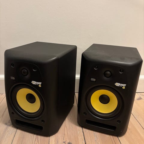 KRK Rokit 5 studiemonitorsæt med gul 5" woofer og sort kabinet. Designet til lydproduktion og mixning med præcis lydgengivelse. Indeholder to højttalere med indbyggede forstærkere og justerbare kontrolknapper på bagsiden.