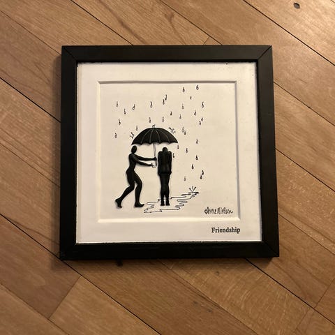 Væg dekoration i hårdt materiale, som viser to mennesker, der indfanger en stjerne. Kunster: Anne Nielsen. Størrelse: 22cm x 22cm.