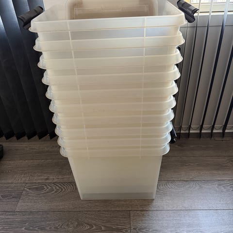 Sæt med 12 gennemsigtige opbevaringsbokse i plastik.