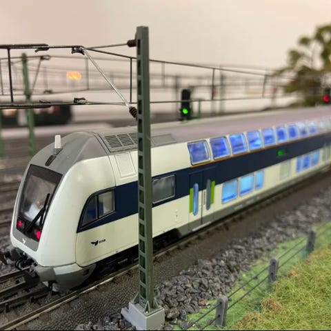 AC modeltog DSB Dobbeltdækkervogne sælges. sæt i HO skala bestående af fire vogne. Toget er fremstillet med detaljeret ydre i hvid og blå farve med grønne dørmarkeringer og vingehjulslogo. Destination: Lyntog Aarhus H