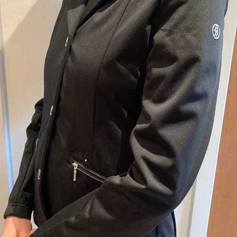 Jakken har en tætsiddende pasform med knaplukning foran og dekorative detaljer. Materialet er strækbart for komfort under ridning.