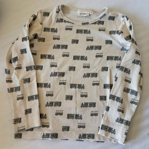 Str 104, men passede min pige i str 92/98. Kan måske bruges længere tid over en nederdel da ærmerne har god længde.