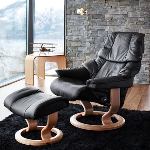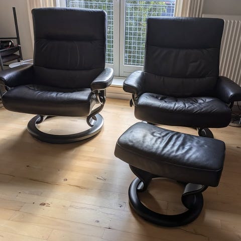 Sælger en original Stressless Reno (Classic) lænestol med tilhørende skammel i læder.