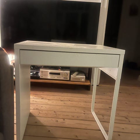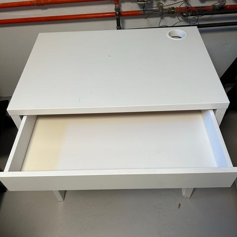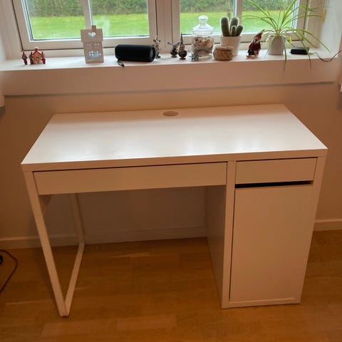 Enkelt hvidt skrivebord, der passer ind overalt. 2 udtræksskuffer og 1 skab, med 2 hylder. Ledningsskjuler i toppen. Nypris: 599,-