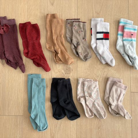 3 par strømper. De grå er fra Tommy Hilfiger og i str. 15-18. De hvide har skridsikre dutter under og er fra Melton. De beige har skridsikre dutter under, og jeg mener, de er fra BabySam, men jeg er ikke helt sikker.