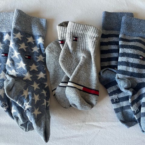Der står kun størrelse i dem fra Tommy Hilfiger, men på det ene billede, har jeg lagt sokkerne ovenpå hinanden, og størrelsen på de andre to par ligner at svare til dem fra Tommy Hilfiger. Kun vasket i neutral vaskemiddel.
