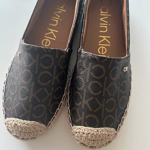 Calvin Klein Loafers og sejlersko i størrelse 38. Skoene har en grå farve og et mønster, der efterligner slangeskind. Indvendigt er de foret med lyst materiale, og sålerne har gummipuder for bedre greb. Velegnet til hverdagsbrug.