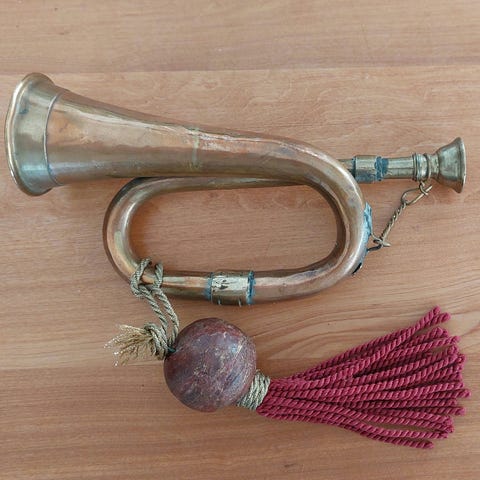 Messing horn med en kæde til ophæng. Hornet har en konisk form og en åben munding. Kan bruges som dekorativt objekt eller til samlerformål.