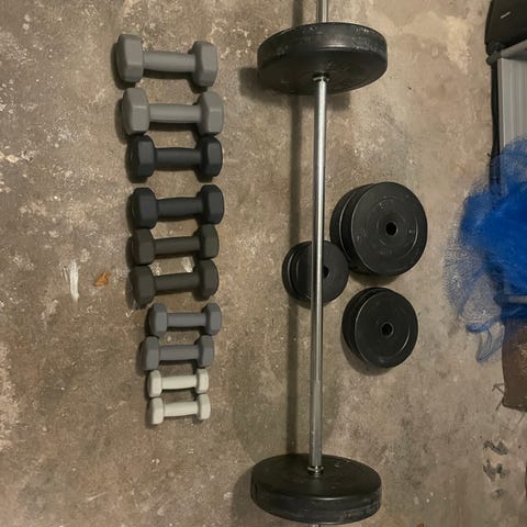 2 stænger, og mange vægte 2x20 kg, 2x10 kg. Og flere mindre kg