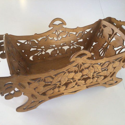Mørklakeret træ med metaldutter og stofpose jvf. fotos.