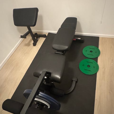 Rigtig lækker bænk med god mulighed for ben træning. Gulvet som ses på billedet kan medfølge.