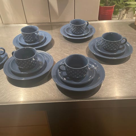 Fredensborg kaffestel bestående af kopper og tallerkener i porcelæn med en enkel blå kant. Sættet inkluderer kaffekopper med tilhørende underkopper samt flade tallerkener. Designet er klassisk og funktionelt.