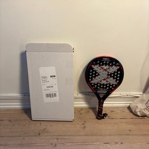 Nox Nerbo WPT Luxury Series padelbat med sort og rød farve, designet til padelspil. Batet har et perforeret mønster for bedre luftgennemstrømning og et greb med hvidt tape. Leveres med et sort batcover mærket Nox Luxury Series.