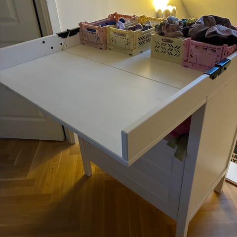 IKEA sundvik puslebord i hvid. Indeholder flere skuffer og hylder til opbevaring. Puslepladen kan klappes sammen, så den kan bruges som almindelig kommode.