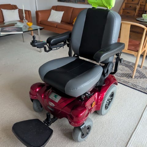 elektrisk kørestol i rød farve med polstret sæde og rygstøtte. Udstyret med justerbare armlæn, fodstøtter og joystickstyring. Kørestolen har fire store hjul med slidstærke dæk og indbygget belysning foran og bagpå. Batterirum med to batterier til elektrisk drift.