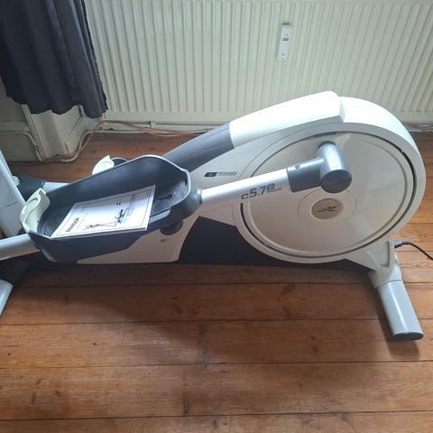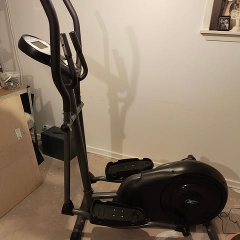 Reebok i-trainer crosstrainer med digitalt display, der viser tid, hastighed, distance, kalorier og puls. Sort farve, designet til indendørs træning. Fin stand.