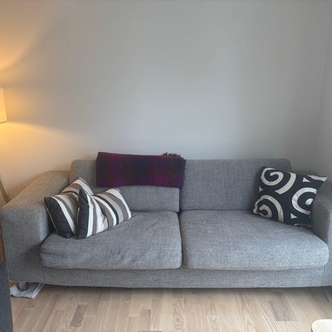 Mørkegrå lille og let sofa. Brugt, men i god stand. Samlet, men samlevejledning medfølger.