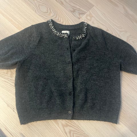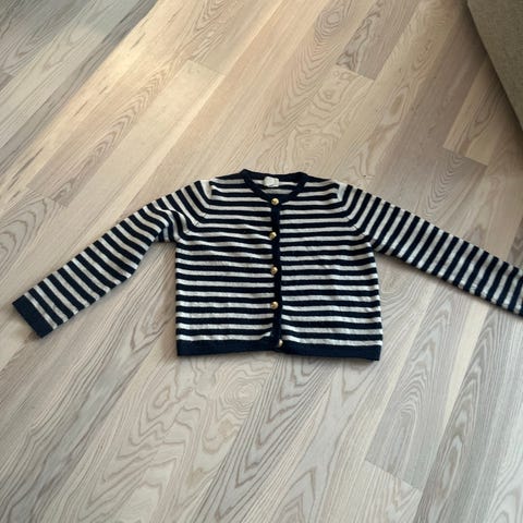 H&M cardigan i størrelse S, fremstillet af polyester. Cardiganen har et stribet mønster i sort og hvid med knapper foran og på ærmerne. Designet er til kvinder.