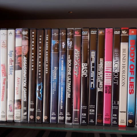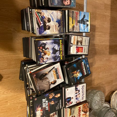 Stor samling af DVD-film med forskellige titler og genrer. Indeholder mange forskellige film, samlet i flere rækker og kolonner, velegnet til filmfans eller samlere.