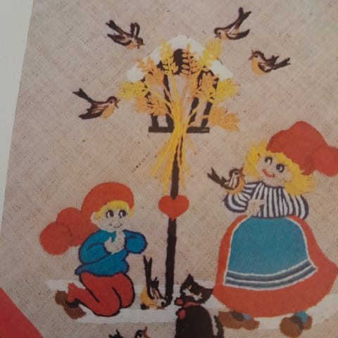 Broderisæt med julemotiver til er juletræstæppe inkluderer mønstre, stof, tråd og instruktioner. Sættet indeholder materialer til at lave et juletræstæppe med juletema, herunder broderede figurer og dekorative elementer i røde og naturlige farver. Materialet er vævet stof, og sættet er velegnet til gær det selv håndarbejde og med start nu er det klar til julen 2026
