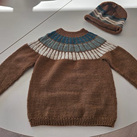 Str. ca.: 6-8 år. Længde: 54cm, bredde: 43cm, ærmelængde: 39. Trøjen måler 117cm fra ærmekant til ærmekant.