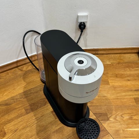 Nespresso Vertuo kaffemaskine i hvid farve. Maskinen har en rundet, kompakt form med en gennemsigtig vandbeholder. Designet til at brygge kaffe med Nespresso kapsler.