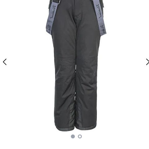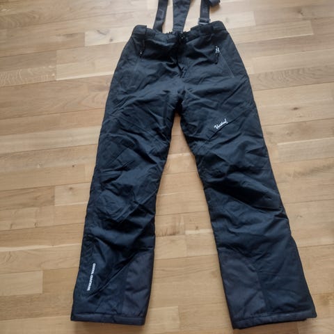 børne skibukser i størrelse 152. Bukserne er sorte oghar justerbare stropper og er lavet af slidstærkt materiale egnet til udendørs aktiviteter.