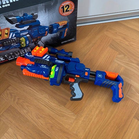Nite Site blaster, blå, sort og orange. Sigtet kan lyse og klappes ned.