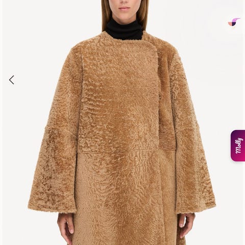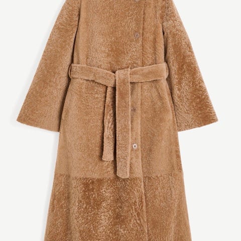 By Malene Birger frakke i sort ruskind, størrelse S. Jakken har et bælte i taljen og en knaplukning foran. Designet til kvinder.