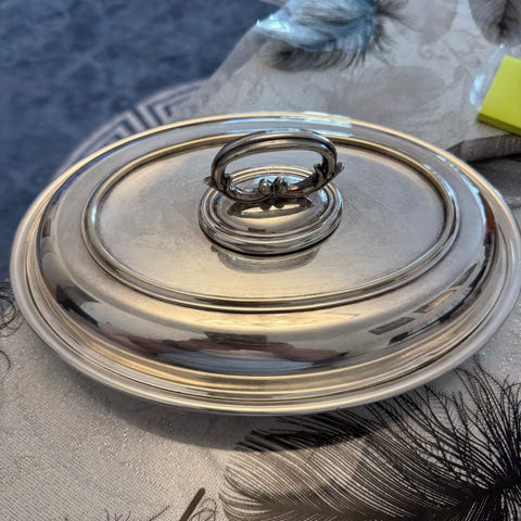 Metalfad med håndtag og netmønster. Fadet er ovalt og har detaljeret udskæring i siderne. Egnet til servering eller dekoration.