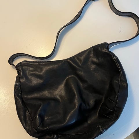 Crossbody lædertaske med justerbar skulderstrop. Den har lille lynlås lomme og ellers et stort rum og et mindre rum. Lidt slidt look fra køb af.