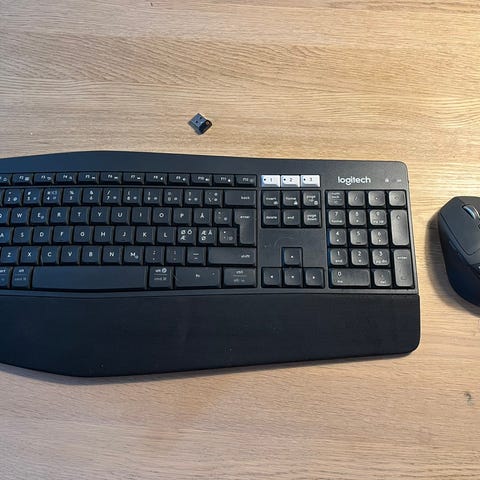 Logitech tastatur og mus sæt i sort farve. Sættet inkluderer et fuldt tastatur med numerisk tastatur og en mus. Designet til almindelig brug med standard funktioner.