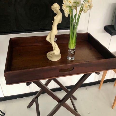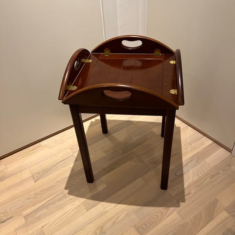 Mindre bakkebord i massiv mahogni med messingbeslag.