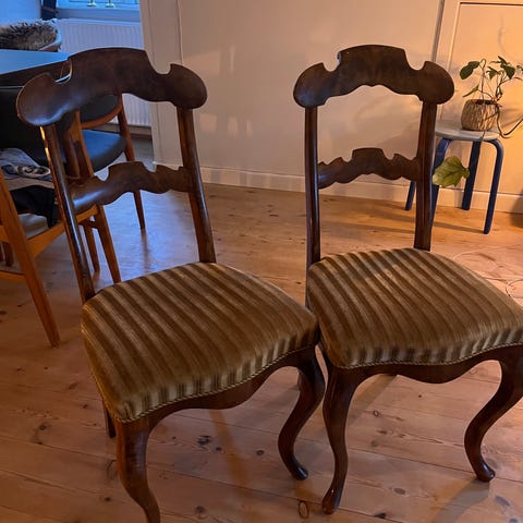 Sæt bestående af 8 træspisestole med polstret sæde. Stolene har udskårne detaljer i ryggen og er designet til brug ved spisebord. Polstringen på sædet er i lyst stof med mønster. Stolene er velegnede til spisestue eller køkken.