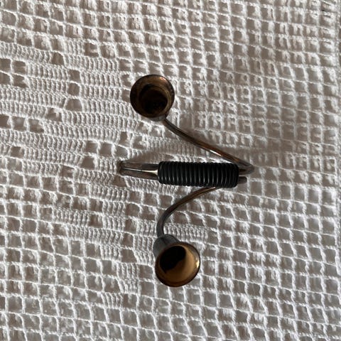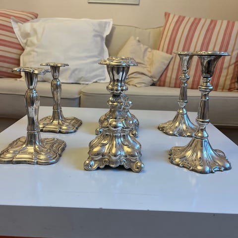 To gamle sølvplet lysestager, med en hel det patina og slid (derfor den gyldne farve flere steder)