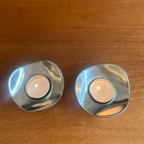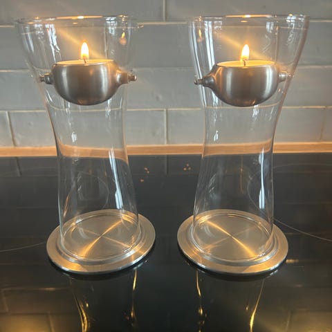 2 stk. Grace fyrfads lysestager fra Georg Jensen i håndlavet glas og rustfrit stål.