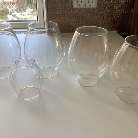 9 cm høje og 7,5 cm brede. Super flotte som fremhæver og pynter på bordet.