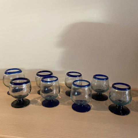 Mexicanske mundblæste “fingertrykkede” glas med blå kant 4 stk 50,- pr skt