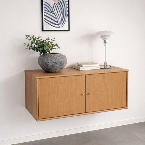 Velholdt vitrineskab/skænk i sæbebehandlet bøg i 2 dele. Over og underskab, væghængt, glaslåger og lys i overskab. Mål på overskab er H 60 B 90 D32 cm