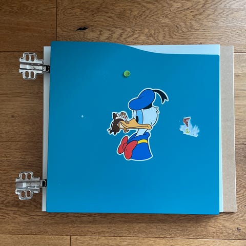 IKEA børnemøbel reol med flere rum, skuffer og opbevaringskasser i forskellige farver. Reolen har brugsspor og mærker, som ses på billederne. Skuffer og låge har været sat i på en måde så reolen har stået på højkant.