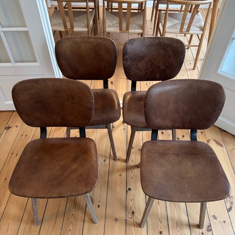 Spisebordsstol, Læder, Ilva, To hvide læderstole med ben af rustfrit stål sælges for kr. 50,- pr. stk. Der er lidt slidtage på læderet.