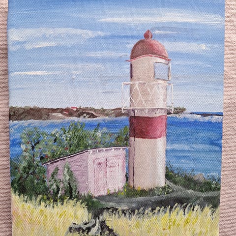 Maleri med motiv af et fyrtårn og et hus i forgrunden, med skibe i baggrunden. Maleriet er indrammet i en træramme med mat glas. Farvetemaet er primært sort, hvid og grå med rødt tag på huset