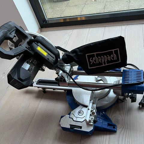 Kap-gerings sav, fuldt funktionsdygtig, til overskæring af f.eks. lister og paneler. Med sammenklappelige ben inklusiv støtte til lange emner.