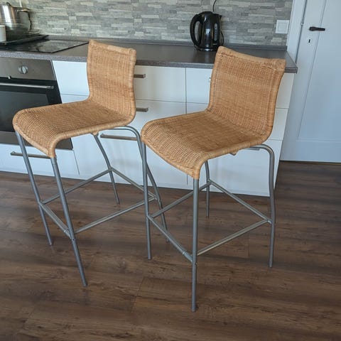 Jeg sælger disse tre barstole i rød og grøn flet. Man sidder virkelig godt på dem, og de har en siddehøjde på 80 cm.