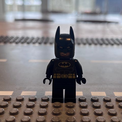 LEGO Batman minifigur med sort kappe, sort maske og grå dragt.