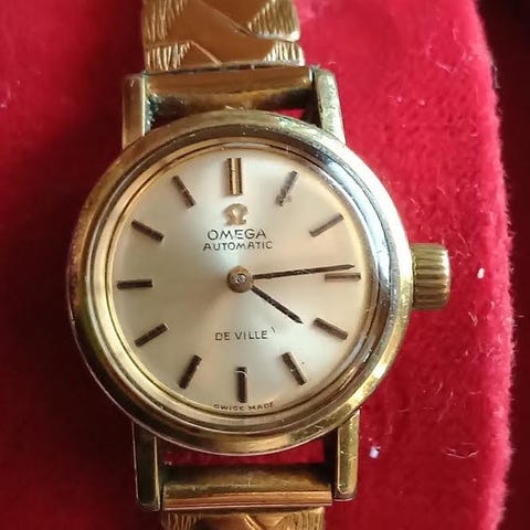 Omega De Ville dameur med kvadratisk urkasse i guldtonet metal. Uret har en hvid urskive med sorte tal og sorte visere. Remmen er sort og lavet af læder. Uret leveres med original æske, international garanti og servicekort.