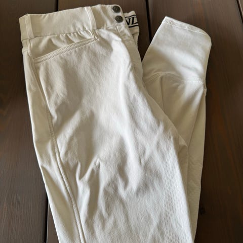 Ridebukserne er i størrelse 38, og i farven Grå